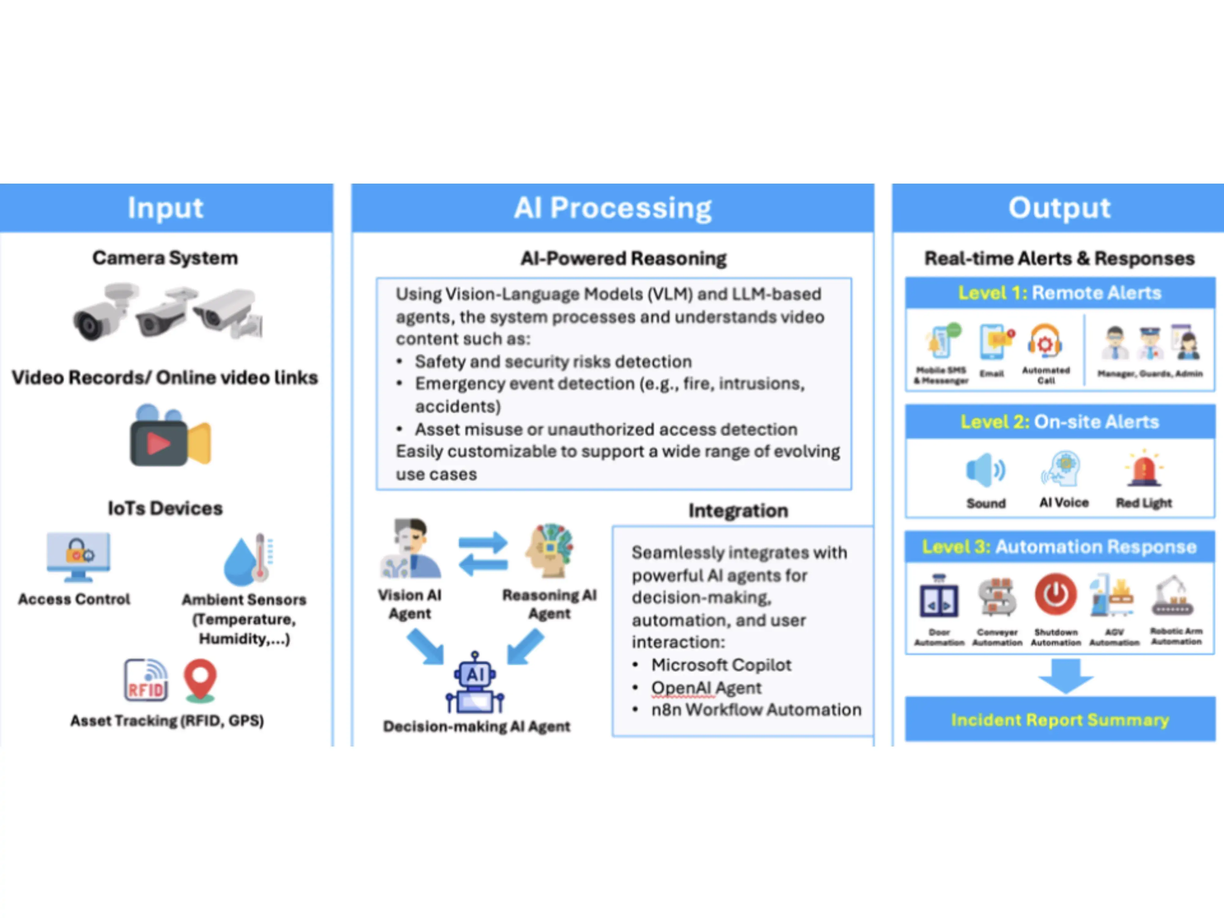Safety & Security Monitoring AI Agent safeguards factories, warehouses, and logistics hubs with real-time IoT monitoring, AI-driven pattern recognition, and instant alerts for threats or rule violations. It integrates with access control and emergency protocols to ensure a safer, more secure working environment.