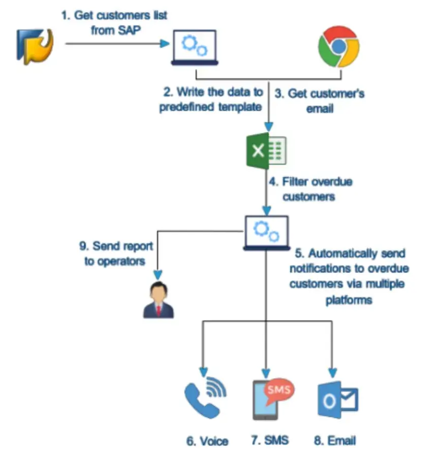 Our team developed a fully automated workflow to send reminders across multiple channels. Our RPA (Robotic Process Automation) solutions include: