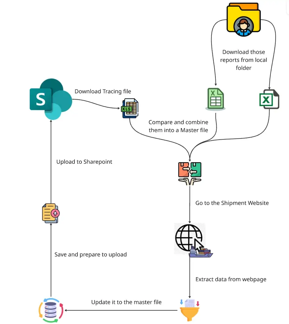Bot accesses SharePoint to download required files. Then, it compares the Tracing file and Raw Data to identify the additional “Shipment Number”.