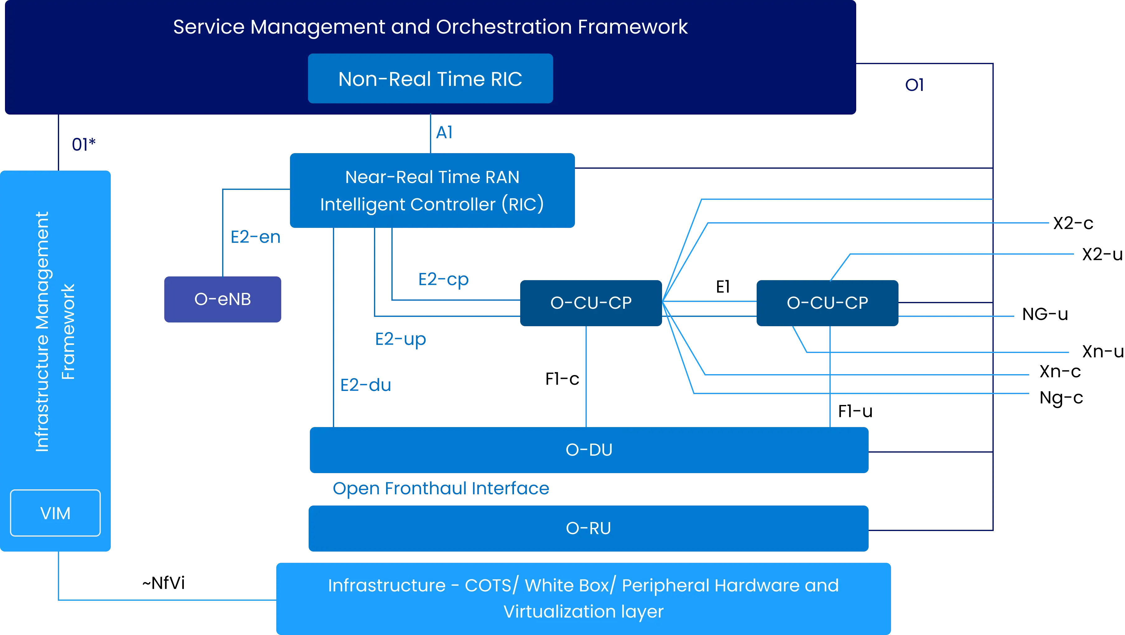 Implement an O-RAN architecture that separates CU/DU/RU for flexible deployment. Integrate a MEC system including: